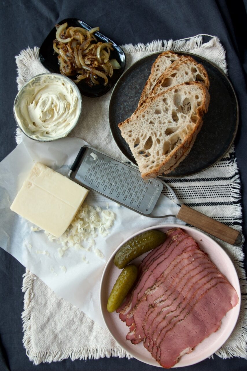 Get ready for the recipe for the juiciest, the biggest, and the most mouthwatering Pastrami-Sandwich New York Style you can prepare at home! A Pastrami Sandwich is an NYC classic and becoming more popular in Germany. It’s no wonder, as a lot of pastrami is stacked on delicious rye bread and spread with mustard cream cheese. The pastrami sandwich is topped with caramelized onions and cheddar cheese and baked in the oven or an air fryer*. It’s a pretty juicy and tender sandwich, so one or two salt-dill pickled cucumbers are enough to go with it. You can serve it with coleslaw or potato chips and enjoy it.