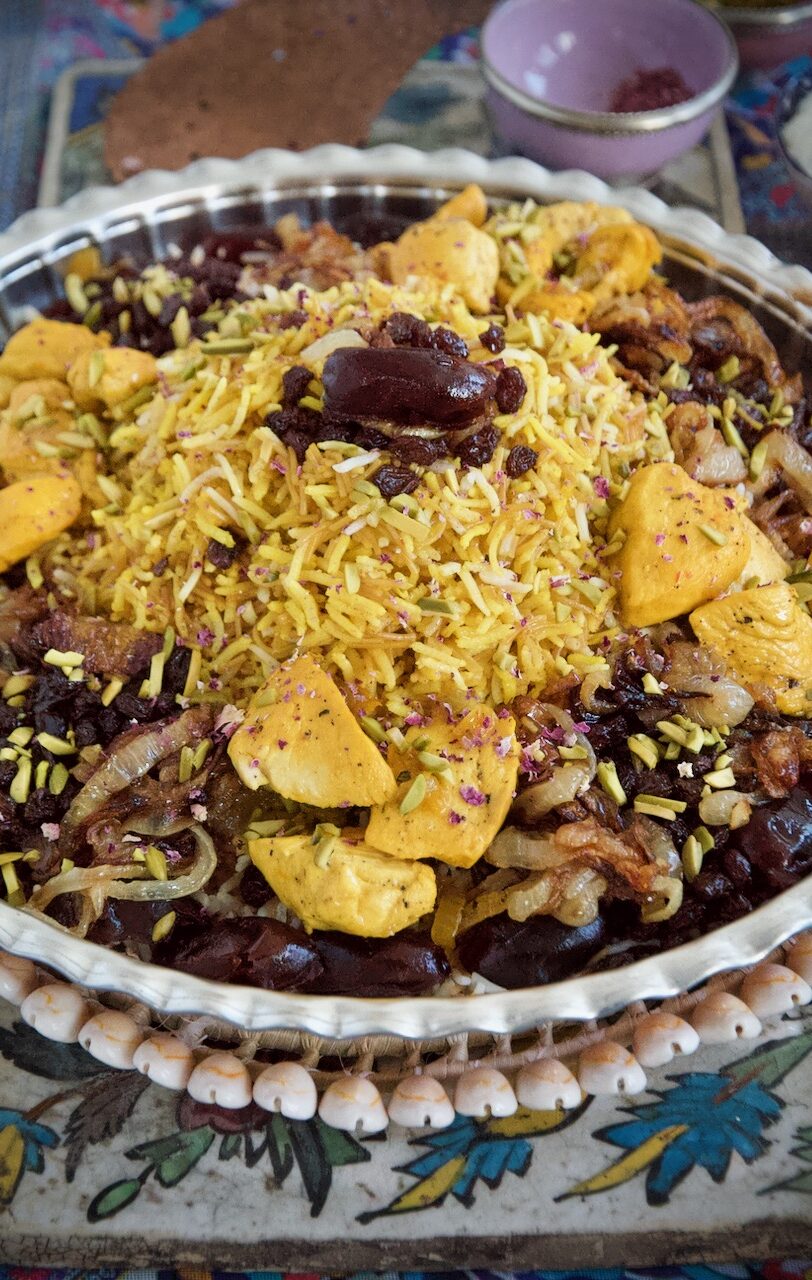 Garnish with saffron rice, chicken breast fillets, onions, raisins, dates, pistachios and rose petals.