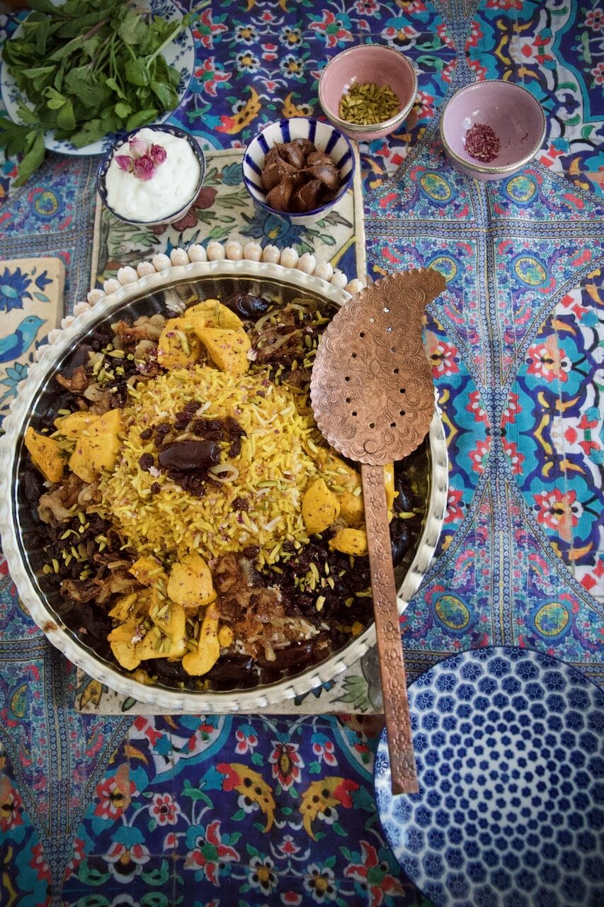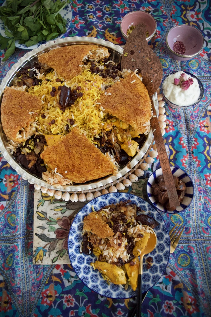 Reshteh Polo ba Morgh – رشته پلو با مرغ is a traditional and popular Persian rice dish from the cities of Tehran, Mashhad, and Kermanshah. The dish immediately takes me back to my grandmother’s house, when the whole family gathered for the Norooz festival at her home, where we lived together for many years. It is an aromatic composition of rice, roasted noodles, caramelized onions, raisins, and dates, refined with aromatic spices such as saffron, turmeric, and cinnamon, and topped with rose petals and pistachio sticks. The brown noodles in the batter provide a crunchy Tahdig. Top it with a slowly braised saffron chicken fillet or without chicken for a filling vegetarian dish. Reshteh polo has warm properties.