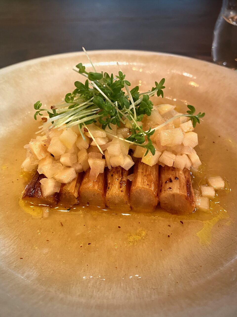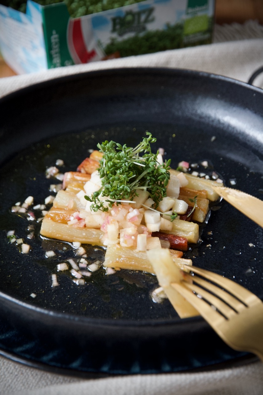 The ultimate dish is served by chef Carl Grünewald himself. Variations of black salsify with garden cress are presented on a beautiful handmade stoneware plate. Never cooked, never eaten, never heard of. Carl created this dish especially for the special event “Enjoy Rheinhessen” and chose the perfect matching wine. If you also want to enjoy his variation, then you should come to the Genusswerksatt until the beginning of November. Oh my god, black salsify, also known as winter asparagus – an almost forgotten root vegetable!