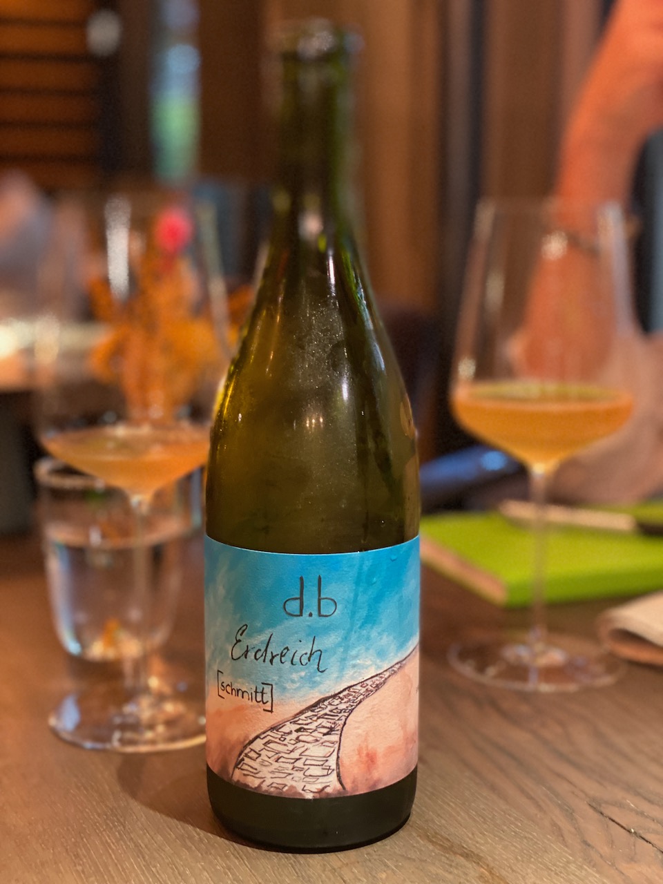 We take a seat at a minimalistic table in the cozy Genusswerkstatt, which has been designed for only 20 guests. The atmosphere is informal and the furnishing minimalistic with accessories made of natural materials. Carl serves an exceptional unfiltered and sulphite free Demeter wine, “Erdreich” from the ecological Schmitt winery in Flörsheim-Dalsheim. A cuvée of Scheurebe grape and yellow Muscatel, the aroma is something between dried fruit and a bouquet of dried wild herbs. The wine is very dry, but hugely concentrated. Erdreich is a typical orange wine, spontaneously fermented on the mash and aged in wooden barrels. A full-bodied natural earthy wine of a very special kind and we will realize soon that it corresponds perfectly to our still secret dish.