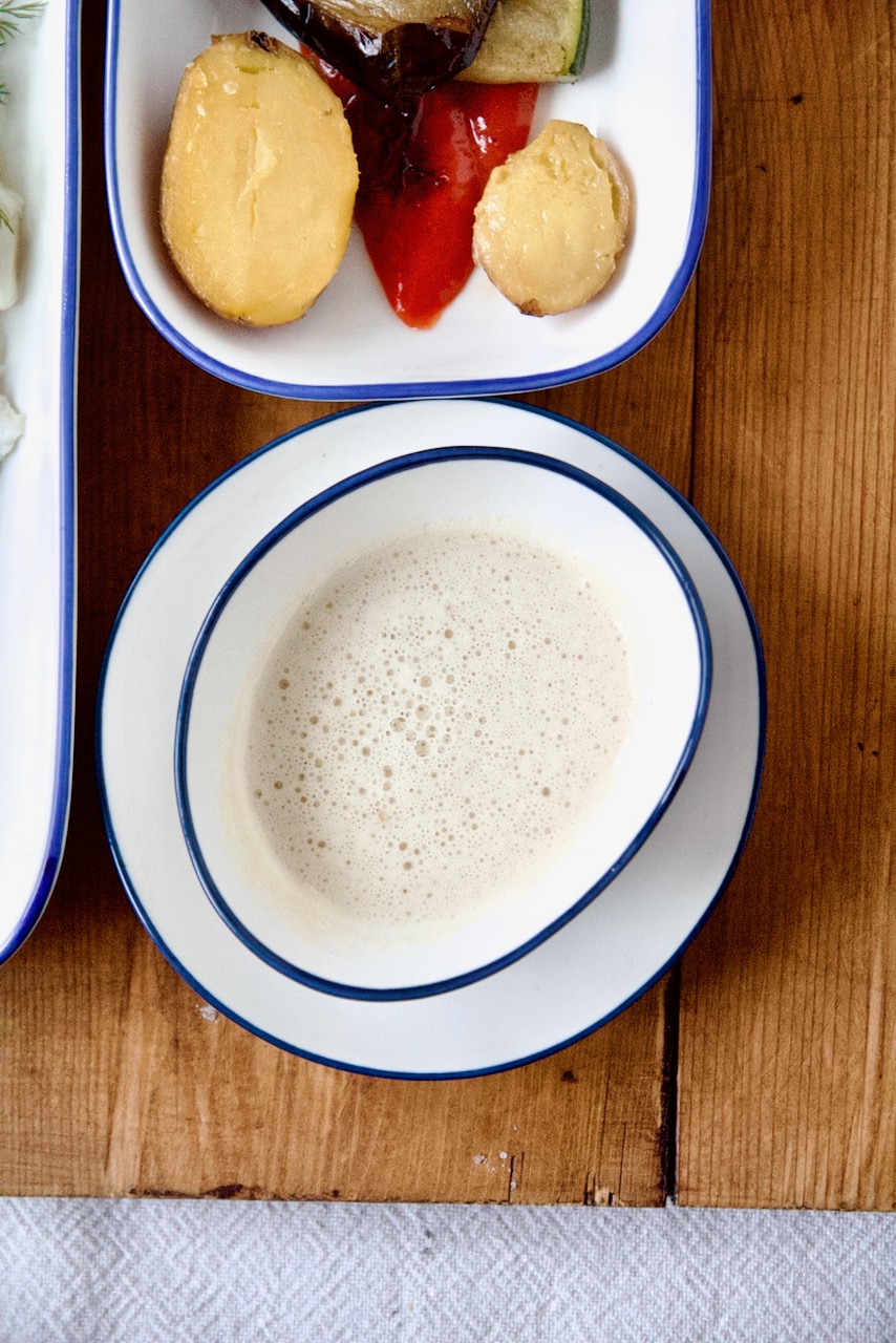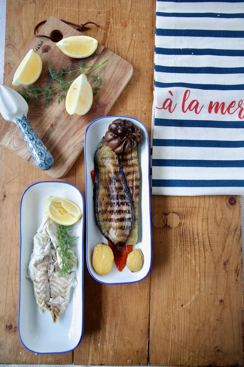 Have your Sea Bream cleaned by your local fish dealer, remove the fins and gills, but the fish scales should stay on. So the fish will not stick to the salt crust. You can also prepare trout, salmon or sea bass in the salt crust instead of dorade. The Breton method is pure yet you can also stuff the fish with herbs. For the salt crust you need double to triple the weight of the fish using coarse sea salt. Some mix the salt with water, others with egg white, but you don’t need neither in the Breton recipe. The salt crust is quite firm after baking beat it up or slice it with a knife. This recipe is plain in the book as I love sauce I chose Mamie Fouesnants shallot cream sauce from the book to accompany it and some grilled veggies.