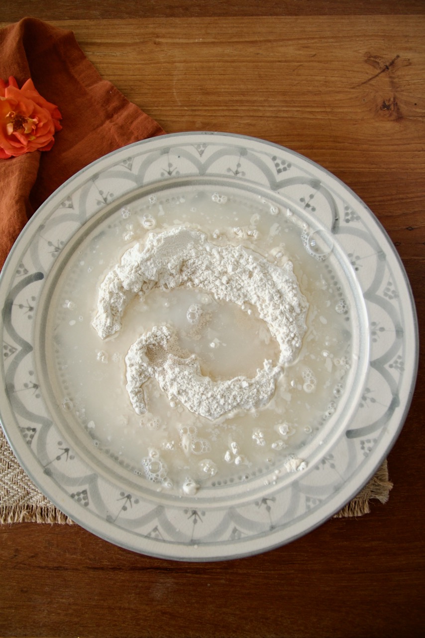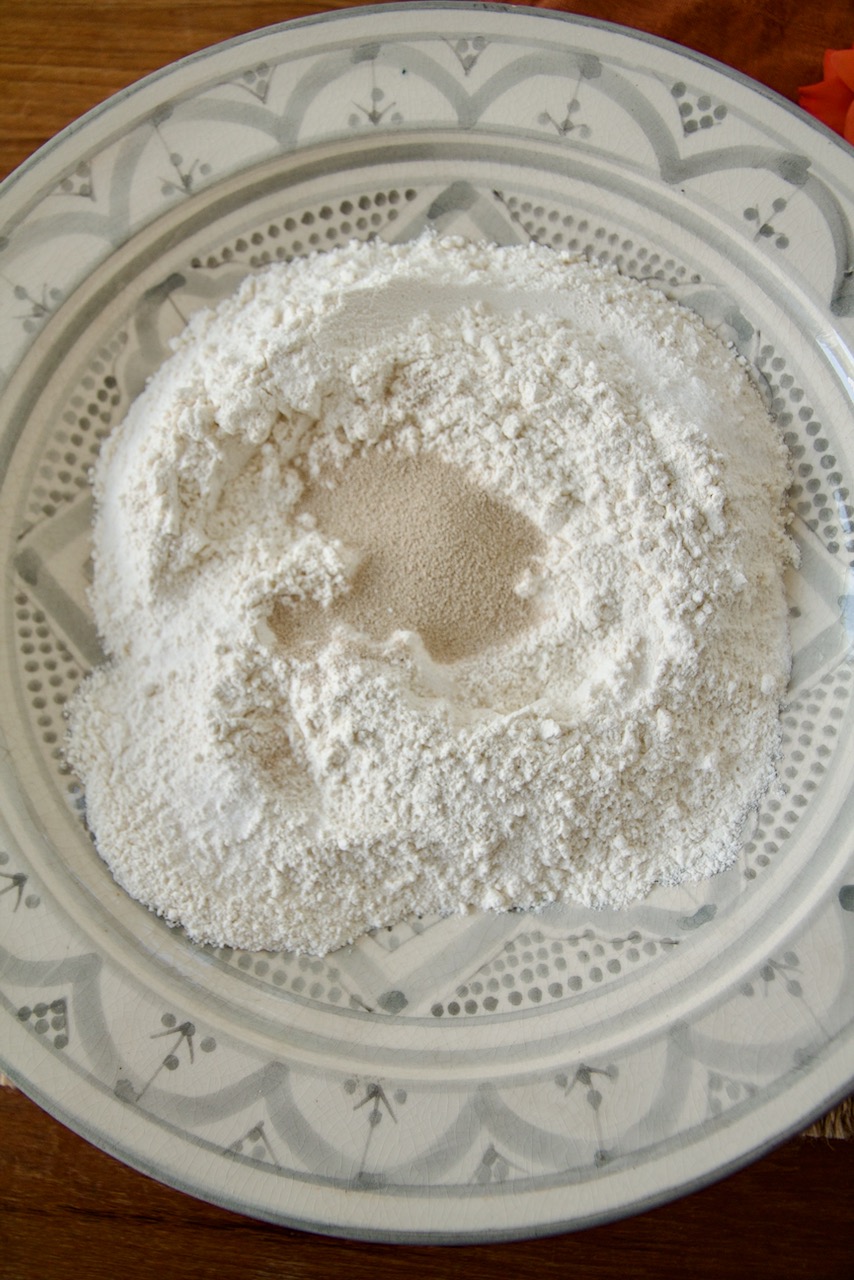 Place the flour, sugar, and salt in a large flat bowl, form a mold in the middle, and add the dry yeast.