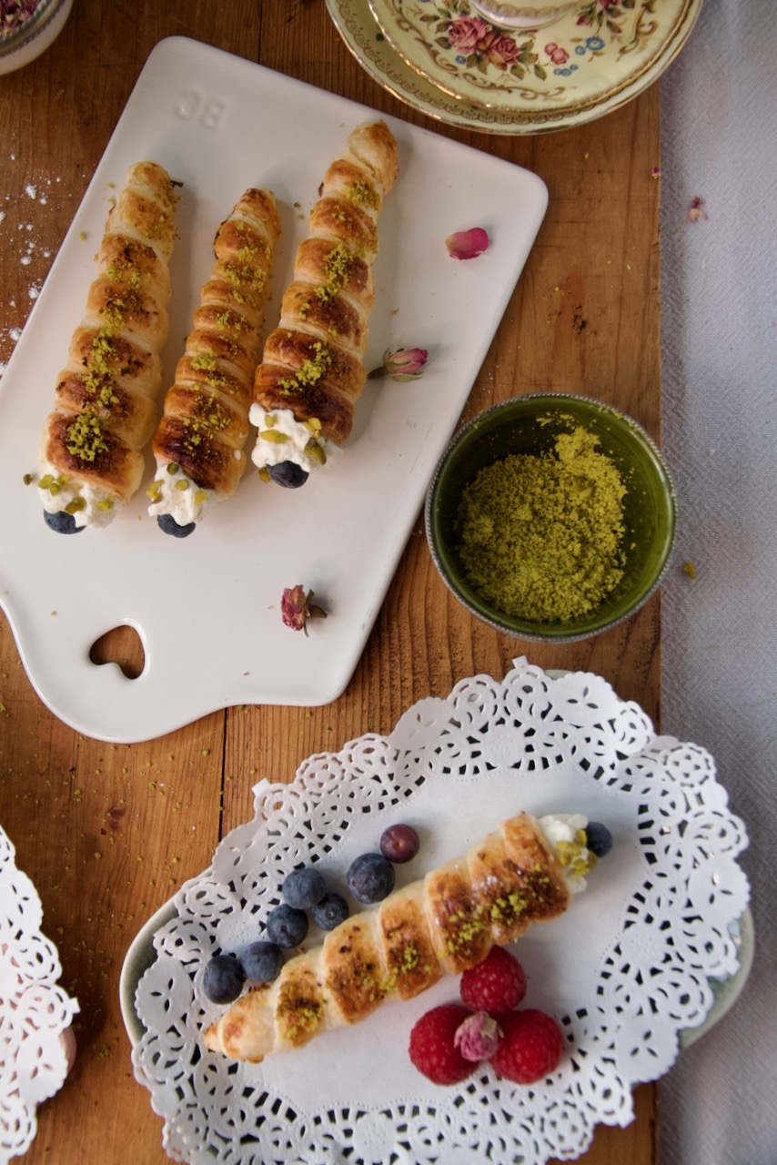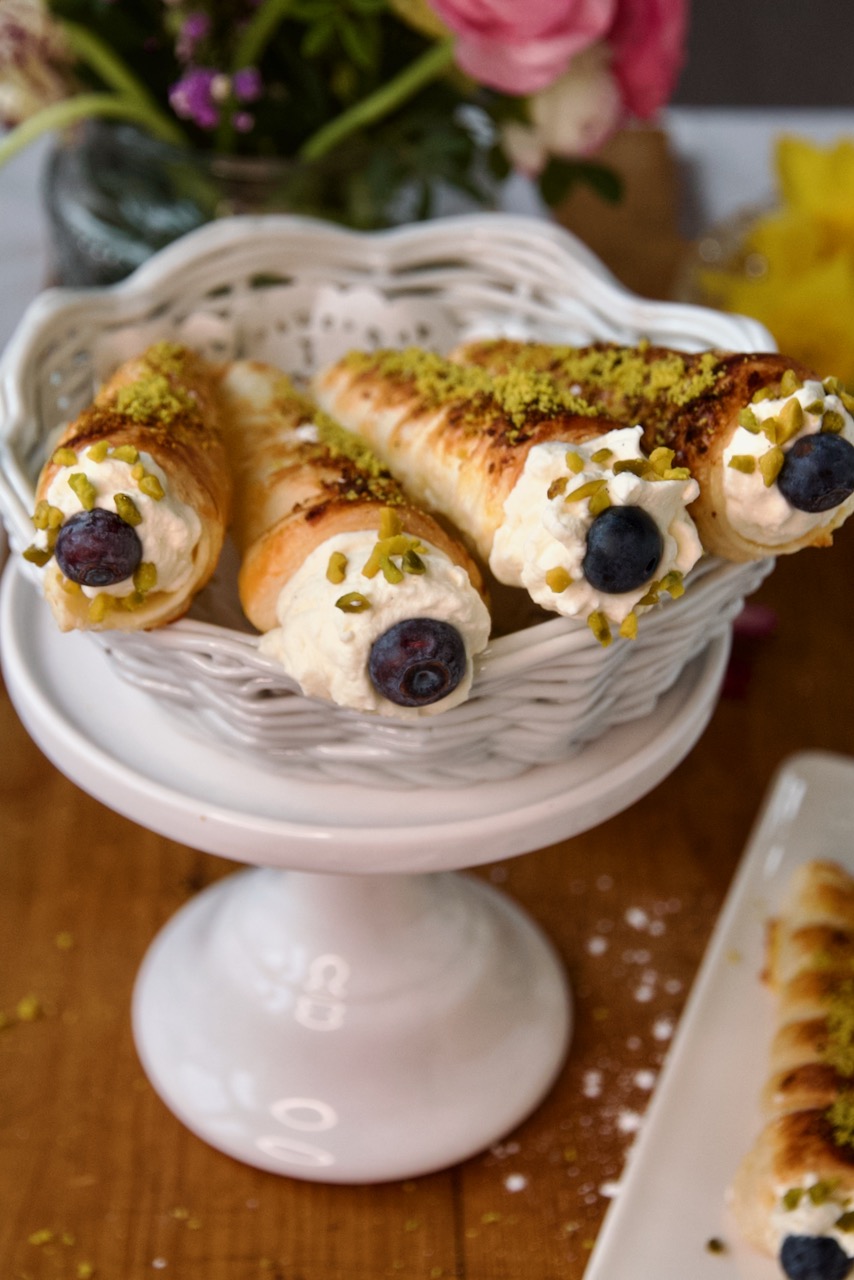 In Germany and Austria, they are also known under the name Schillerlocken. This pastry was inspired by the curls (Locken) of the German poet Friedrich Schiller. For this recipe, you need Cream Horn molds, or make your own out of aluminum foil. Flavor the cream with vanilla or rose water, depending on your taste. I also like to add some chopped pistachios to the cream.