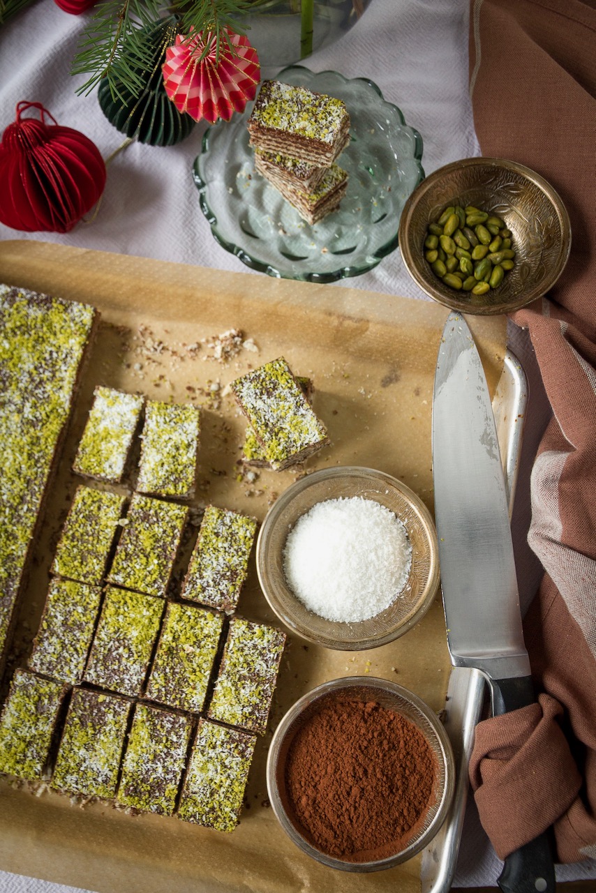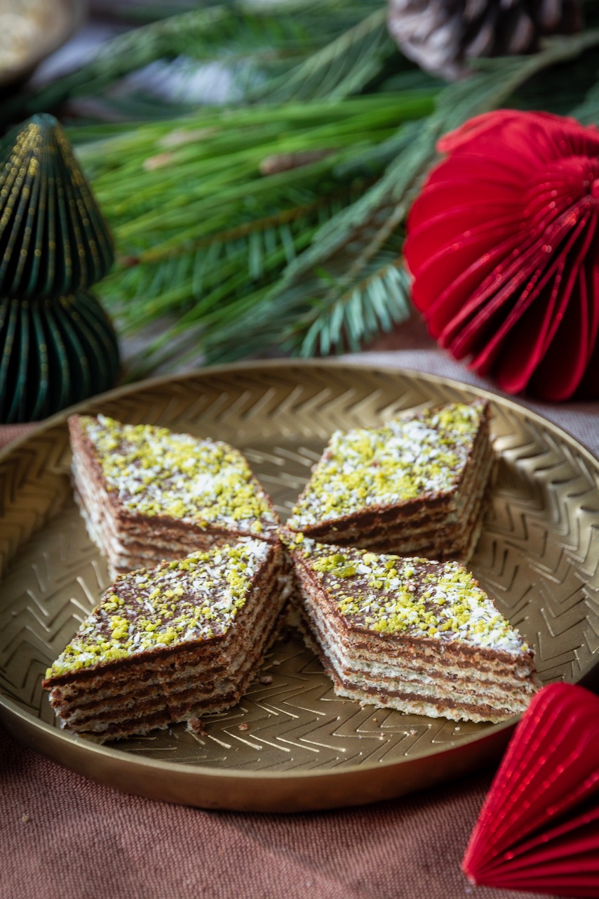 If you love the satisfying crack of crispy wafers, the warm aroma of cardamom, cinnamon, and vanilla, and soft chocolate that melts on your tongue, topped with pistachios and coconut, then Shirini Mikado – Halva Wafer Slices with Cocoa is just for you. The best part? You don’t even need to heat up your oven – just a simple pan will do.
