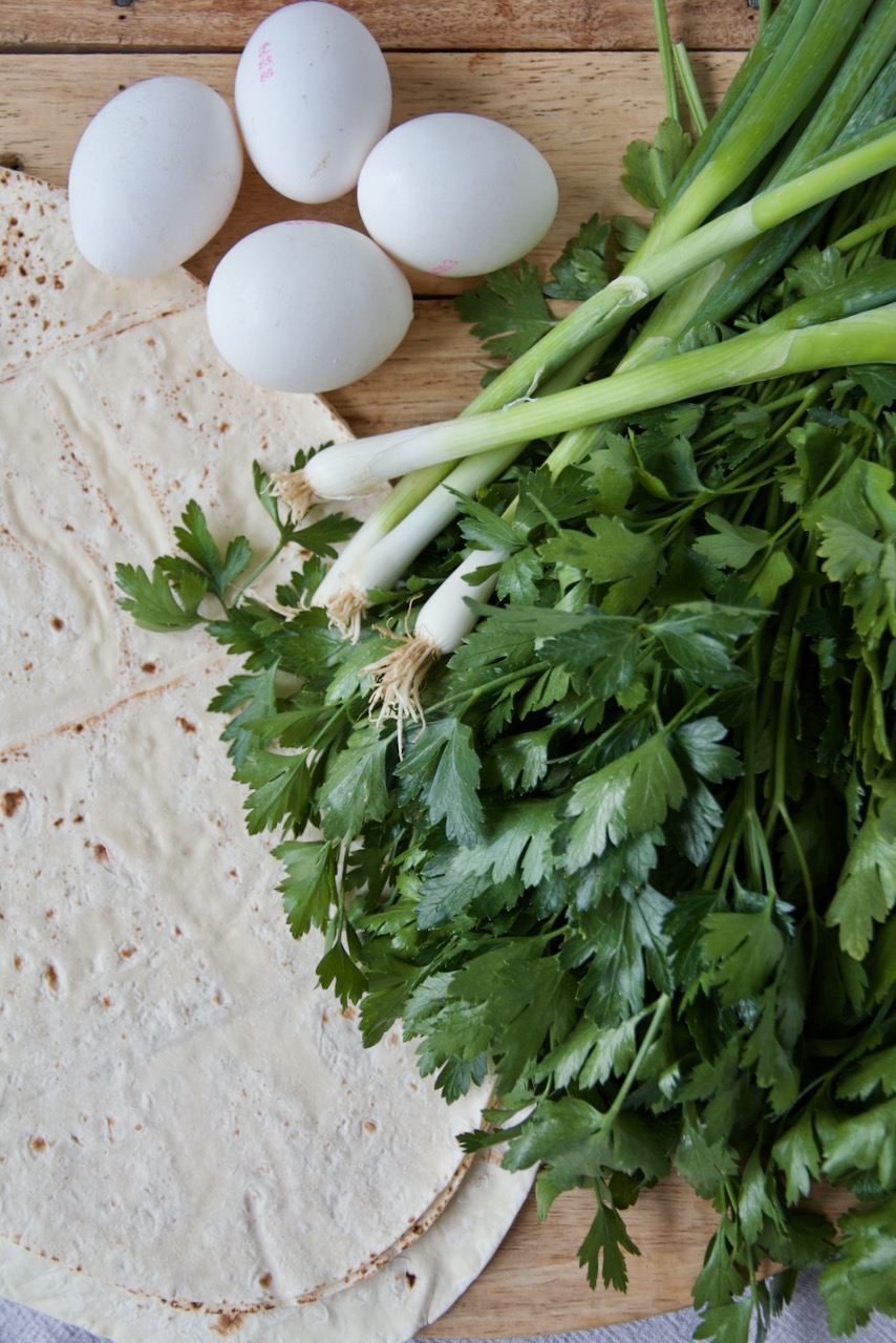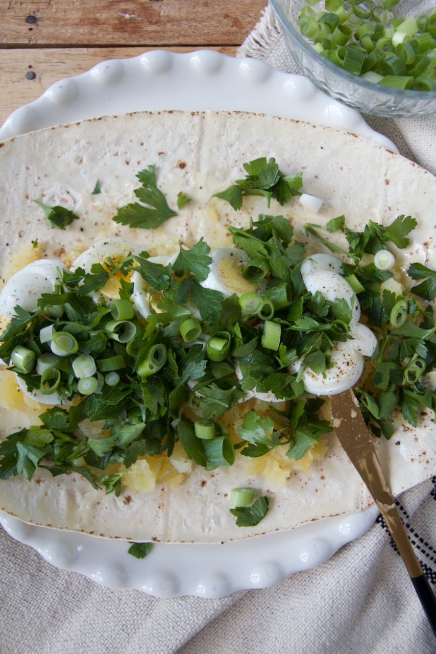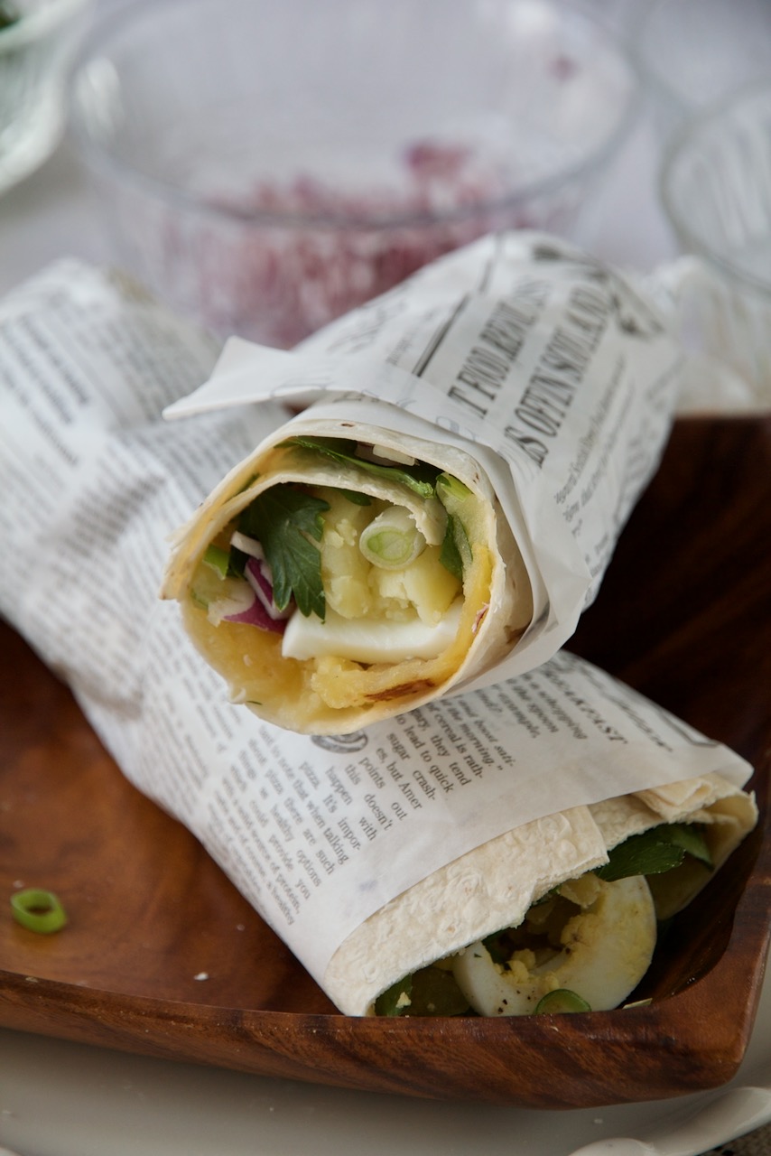 Spread butter on bread. Place potatoes (you can use them with or without peel, depending on your taste) on the bread and mash them. Slice the boiled and peeled eggs and place them on top. Season with salt and pepper, garnish with onions or spring onions, and flat-leaf parsley. Fold in the bread at the bottom first so nothing can fall out, then fold in the sides and roll it all up. Wrap in paper and cut in half. Serve immediately. It is best drunk with doogh.