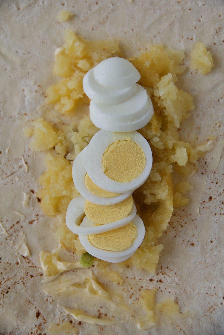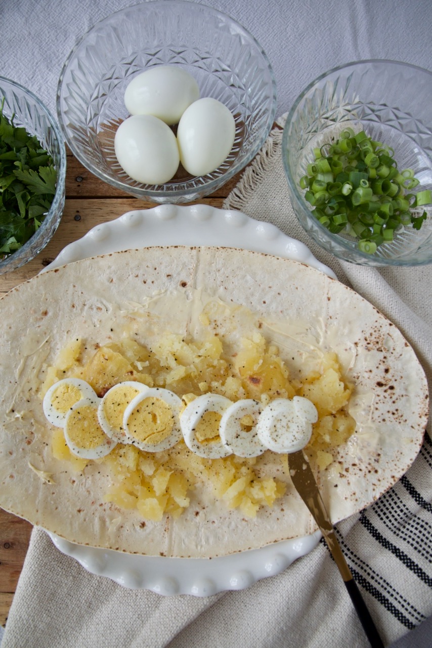 Spread butter on bread. Place potatoes (you can use them with or without peel, depending on your taste) on the bread and mash them. Slice the boiled and peeled eggs and place them on top. Season with salt and pepper, garnish with onions or spring onions, and flat-leaf parsley. Fold in the bread at the bottom first so nothing can fall out, then fold in the sides and roll it all up. Wrap in paper and cut in half. Serve immediately. It is best drunk with doogh.