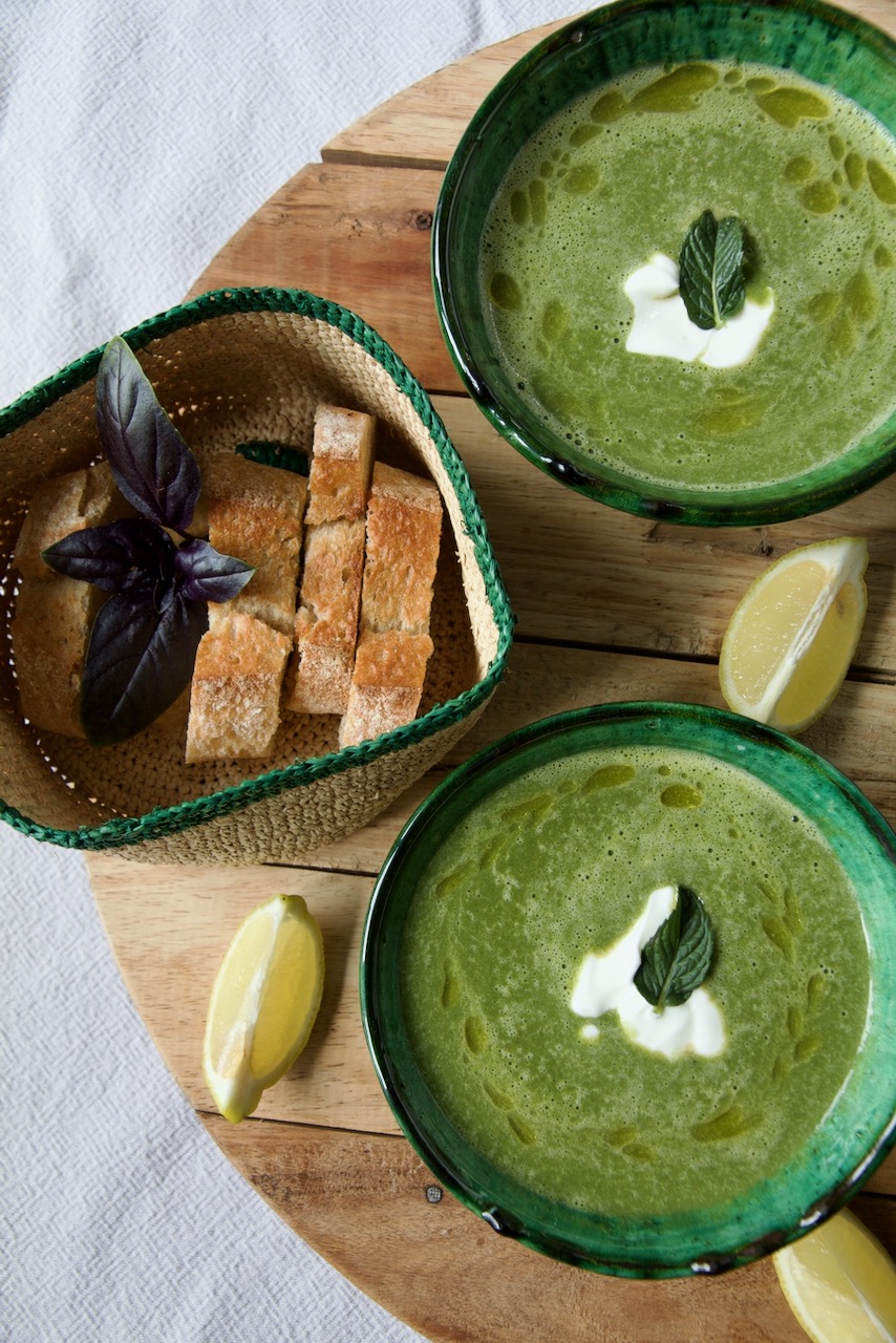 Place a blob of Greek yogurt on the spinach soup and garnish with fresh mint or other herbs. Drizzle with olive oil and season to taste with salt and ground pepper.