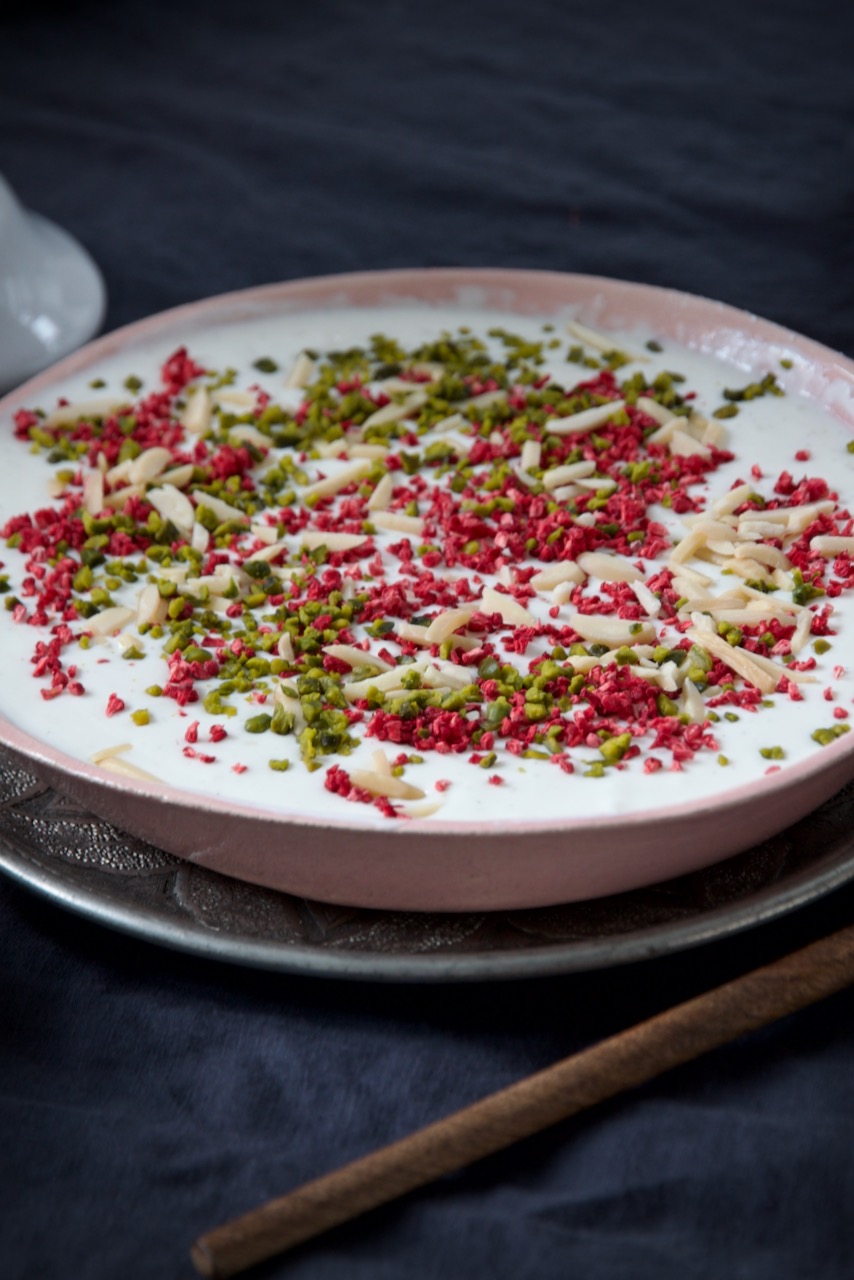 The next day, you can place a serving plate over the bowl, flip it over. Carefully remove the plastic wrap. Use the remaining juice to brush any pale spots on the pudding. Decorate with fresh fruit and serve with orange blossom labneh.
