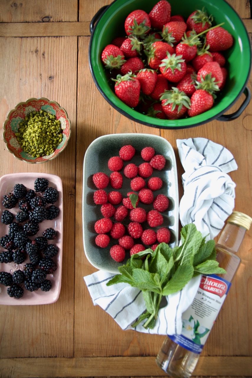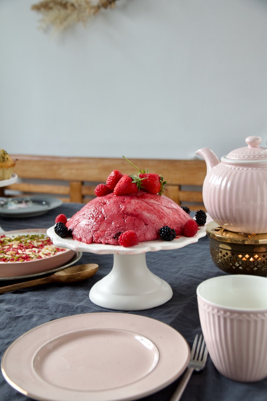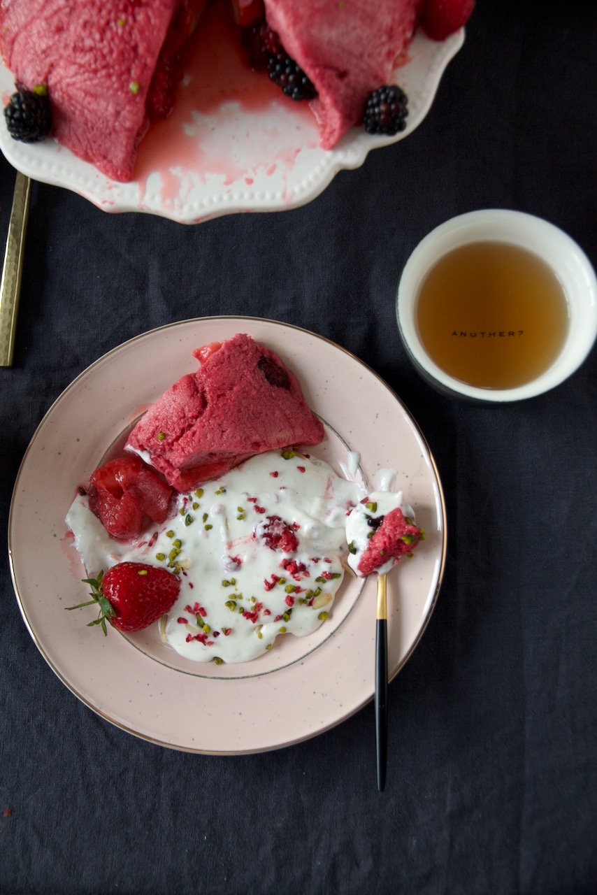 Finally we have strawberries in Germany and this summer pudding with labneh and orange blossom water, is packed to the top with them. Ok, the orange blossom labneh is not typically British yet, but I think it goes perfectly with it. Summer pudding is really easy peasy to prepare, you just need fresh strawberries, some raspberries and blackberries, chopped pistachios, some powdered sugar and brioche. The dessert should be refrigerated for at least 8 hours, preferably overnight.