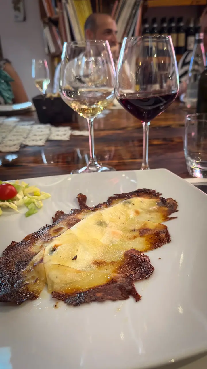 In a cooking class, we learn how to make Parmigiana di Melanzane e Baccalà: cod from the Faroe Islands is soaked for two days, patted dry, dusted with flour, and fried until crisp. It’s then layered with tender eggplant, a tomato sauce simmered for eight hours, and a sprinkling of fine Parmesan. A refined, deeply flavorful twist on the classic.