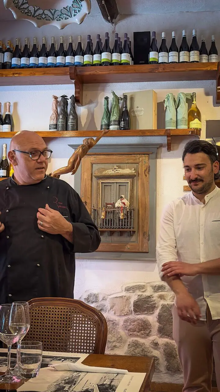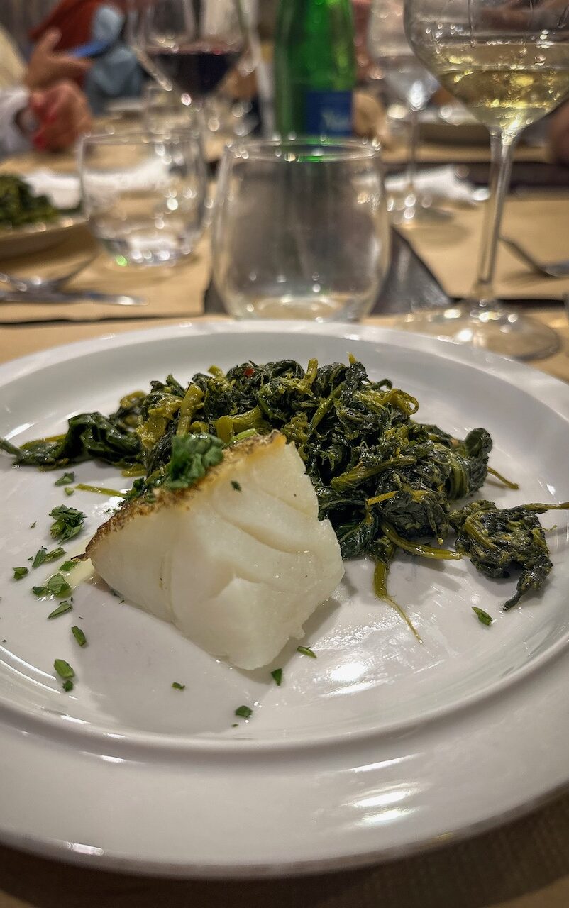 At the long communal table, we savor more creative cod dishes, served with friarielli, a local leafy green sautéed in olive oil with garlic and chili. For a sweet finale, Chef Linda Vongara from Paris presents a light vegan strawberry mousse, a delicate touch of French elegance to end the meal.