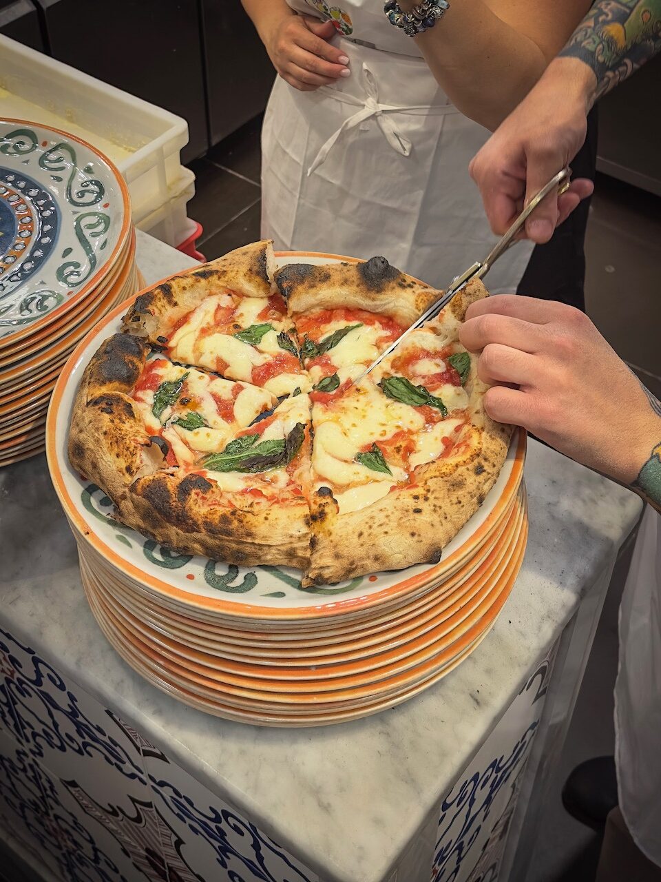 With a wooden peel, the pizza slides into the blazing stone oven. Ninety seconds later, the crust has risen beautifully, the center is tender, and the cheese is perfectly melted. Then comes the Neapolitan twist: the pizza isn’t sliced with a knife but with scissors – to keep that airy crust from being crushed. We laugh, taste, compare results, savor. And with the first bite, it’s crystal clear: this isn’t just any pizza. This is tradition, craftsmanship, and pure joy rolled into one.
