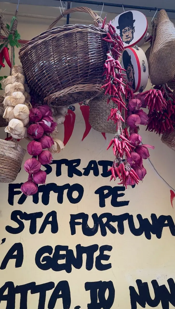 In Naples, you’ll see Pulcinella everywhere. He’s the famous character with a long nose, a pointy hat, and a big grin. He appears on shutters, murals, or as little statues among citrus fruits and lucky charms in souvenir shops. Sometimes funny, sometimes mysterious, Pulcinella shows the city’s joy, creativity, and cleverness. At Via dei Tribunali, there’s a statue—rub his nose for good luck. We couldn’t resist!