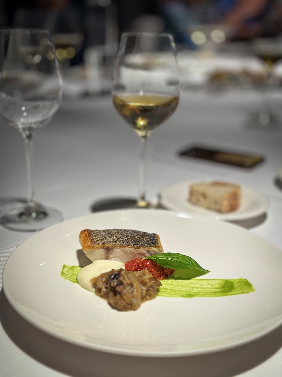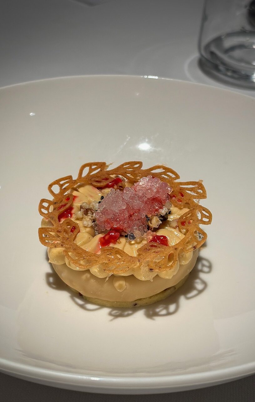 Then comes the showstopper: the restaurant’s signature dish, Tagliolini Antica Trattoria. Fresh pasta in a bright, lemony cream sauce, topped with red shrimp, monkfish roe, and creamy spinach, creating a perfect harmony of sea, citrus, and richness. We pair it with a Benito Ferrara Vigna Cicogna Greco di Tufo – elegant, mineral, and perfectly balanced with every bite.