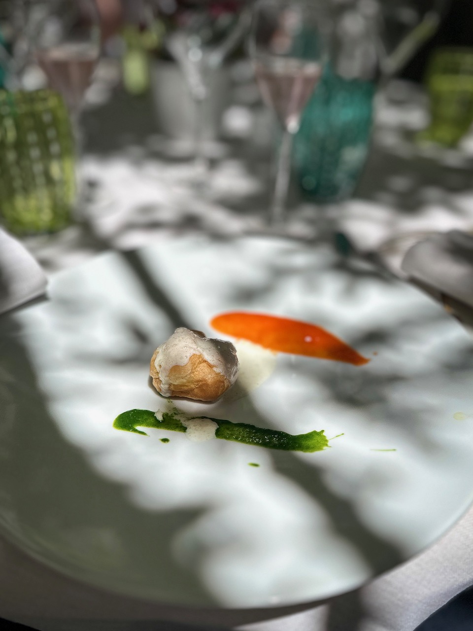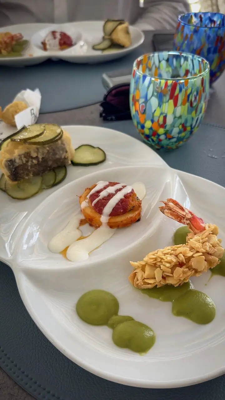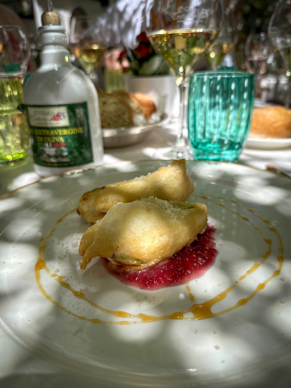Under a lush pergola draped with grapevines, where dappled sunlight dances across the table, we settle in for a lunch made for savoring. To start, crispy zucchini blossoms stuffed with creamy ricotta and delicate ham arrive on a mild zucchini sauce topped with smoked cheese. A tender-crispy play of textures that instantly delights.