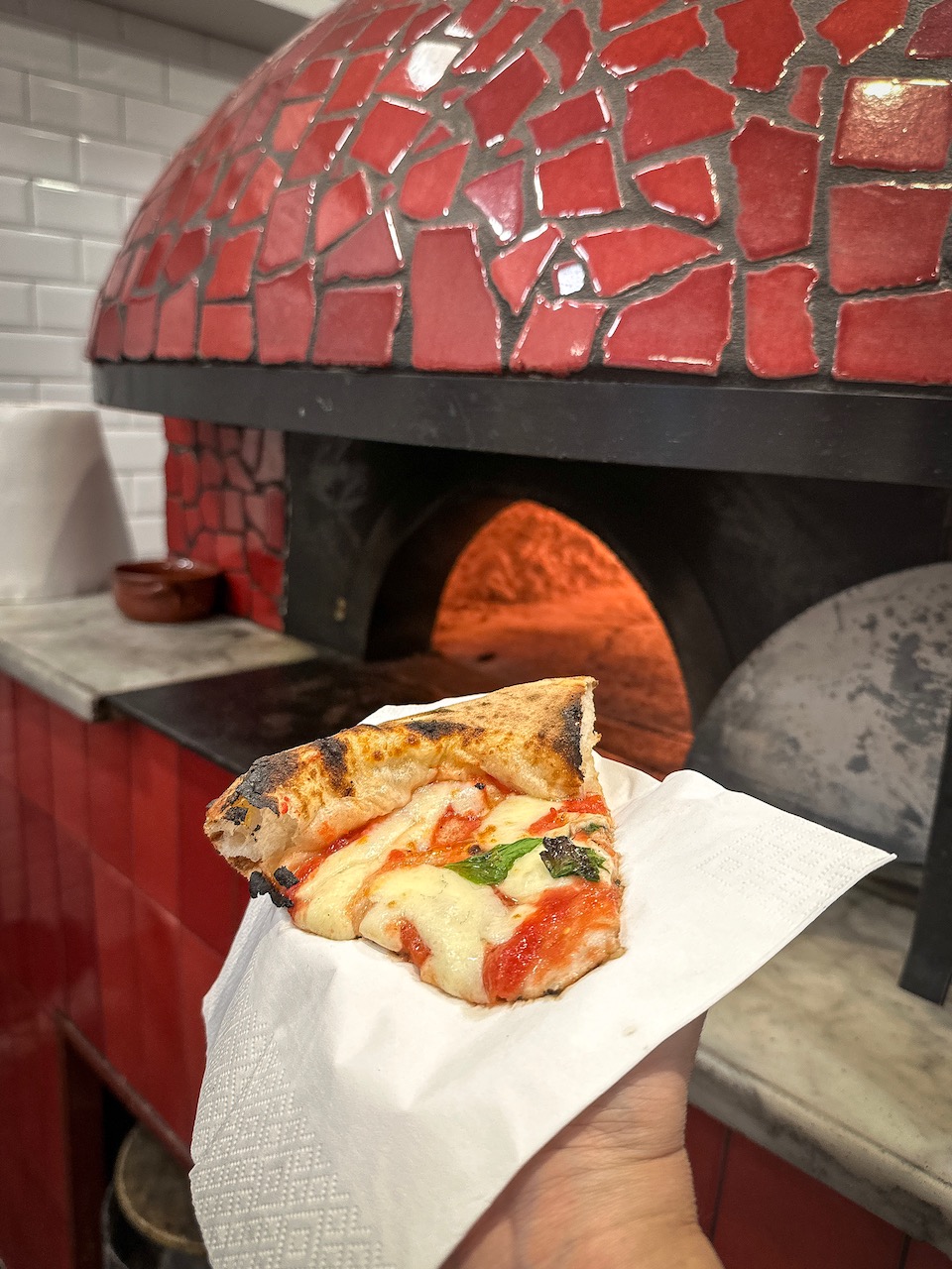 The toppings are pure tradition: San Marzano tomatoes, fior di latte from Agerola, 24-month-aged Parmigiano Reggiano, fresh basil leaves, and a drizzle of golden-green PDO extra virgin olive oil from a copper oliera, the classic Neapolitan oil can (which I instantly decide I need to buy for myself).