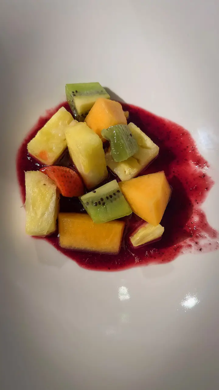 For dessert, a colorful medley of fresh fruit on a velvety berry coulis, light, fresh, and the perfect ending to our journey.