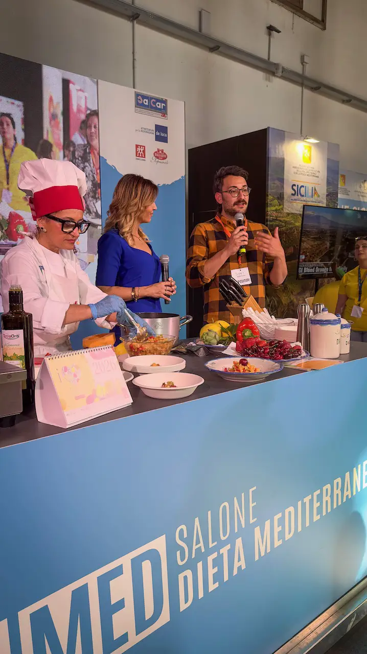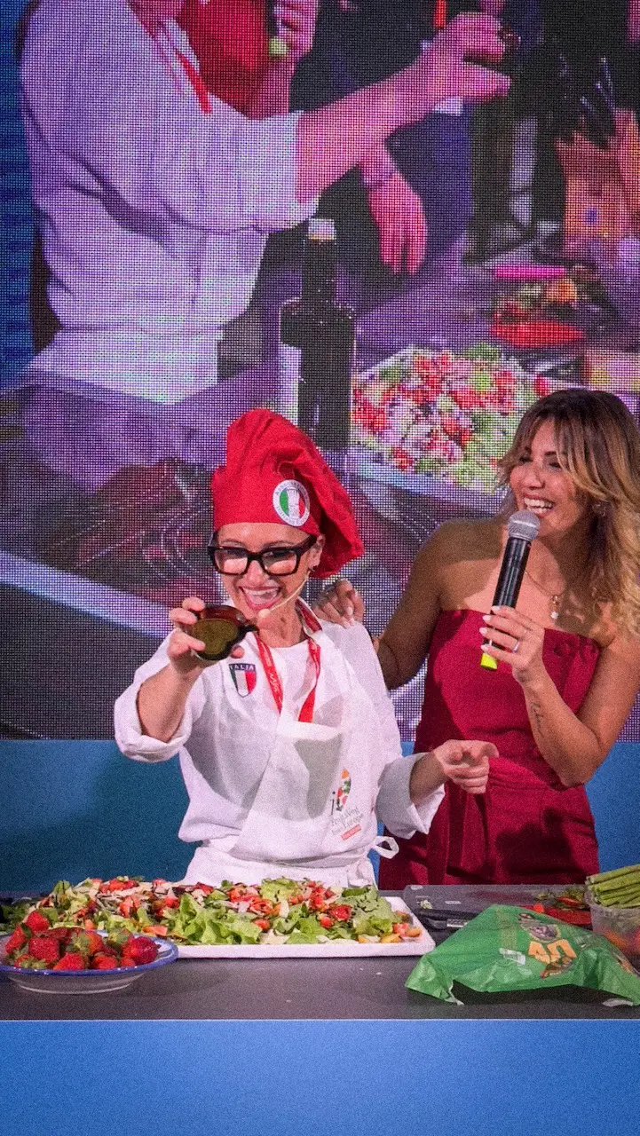 In the afternoon, we return once more to the Salone della Dieta Mediterranea in Paestum. Chef Dorina Burlacu celebrates Mediterranean cuisine by preparing an artichoke salad with melon and watermelon, fresh, light, and bursting with summer flavors.