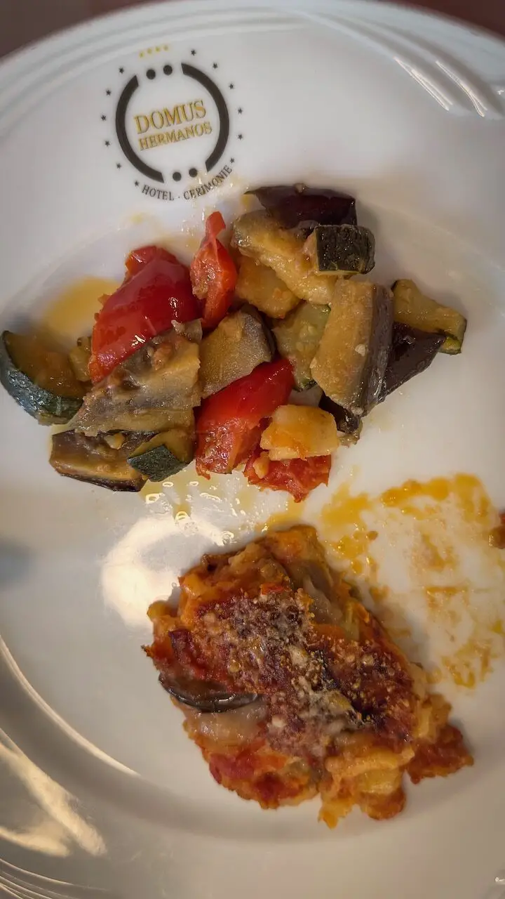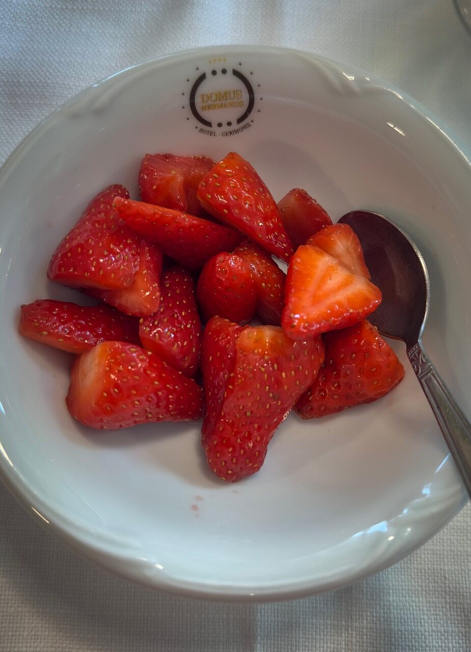 At lunchtime, we visit Ristorante Hermanos in Capaccio, where the sea practically sets the table for us. On our plates, fresh local mozzarella meets vegetables straight from the surrounding gardens. Juicy tomatoes, creamy eggplant, crisp zucchini, and fragrant herbs lovingly transformed into authentic regional dishes. We enjoy pasta in a rich eggplant sauce and a tempting selection of antipasti that rounds out the meal perfectly. To finish, the team serves the sweetest strawberries in the region, a fruity finale that captures the taste of Cilento’s sun in every bite.