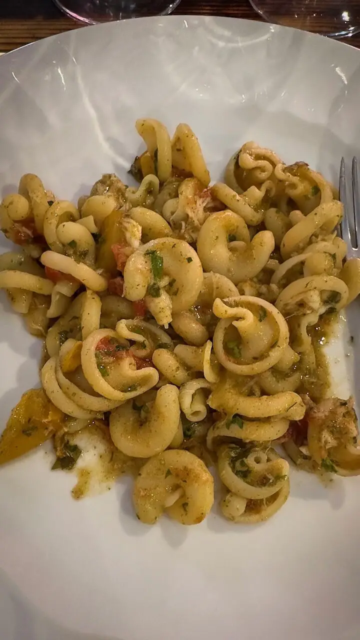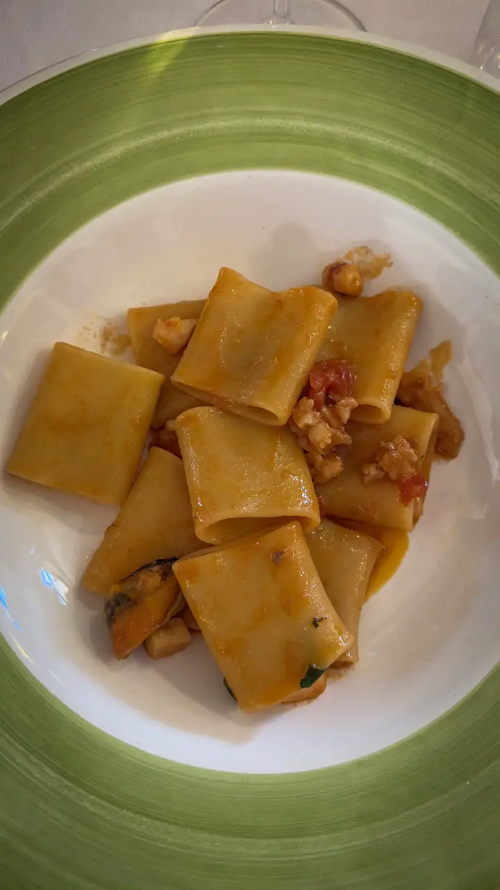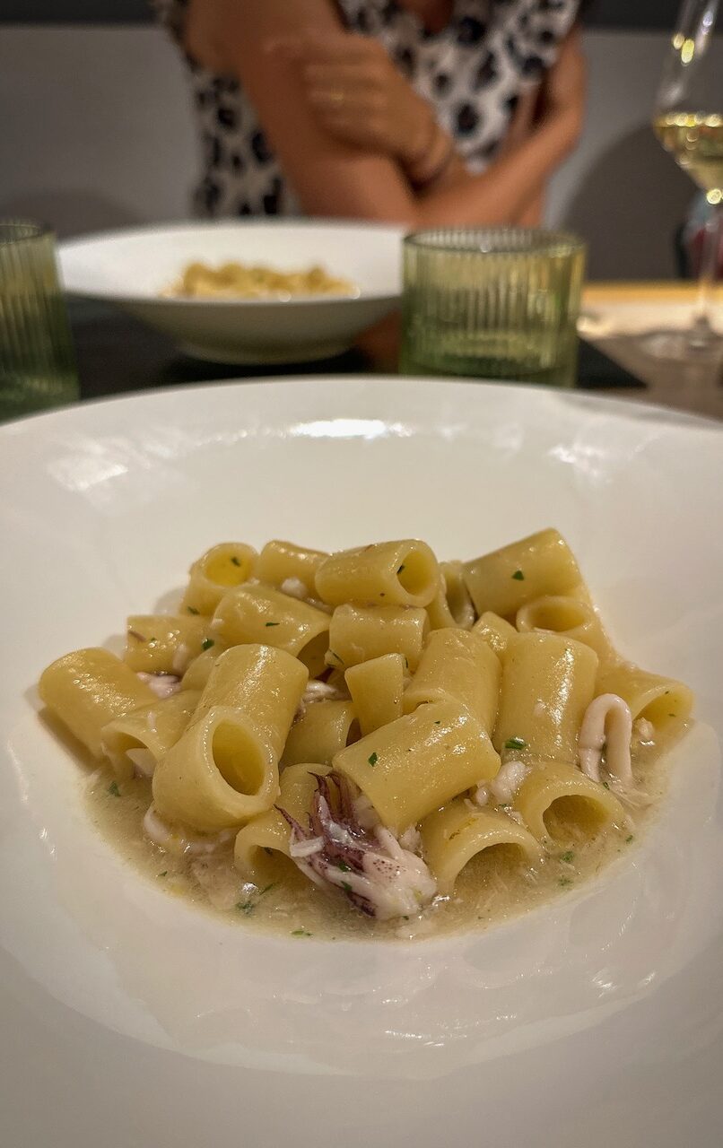 n the evening, we enjoy a wonderful dinner at MEC Hotel Paestum, a menu that perfectly showcases the variety and freshness of Mediterranean cuisine. I was particularly enchanted by the Ditaloni from Gragnano with baby squid and lemon zest, one of my favorite pasta dishes of the entire trip.