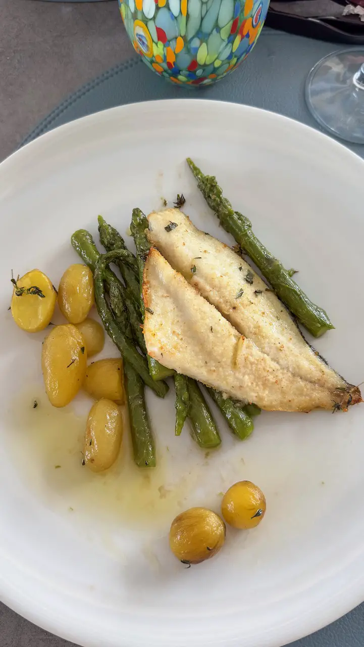 → Oven-roasted fish served with tender new potatoes and fresh asparagus