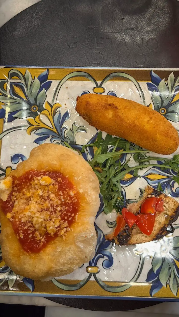 Just around the corner from our hotel, our journey through Naples begins – not with sightseeing, but with a true treat for the taste buds. Gaetano Adamo, pizzaiolo and warm-hearted host, welcomes us to his namesake restaurant and pizzeria with a generous midday feast. We start with a fruity, floral Vino Spumante I Magredi Ribolla Gialla Brut, paired with bruschetta, pizza fritta, and crisp panzerotti filled with tomatoes, ham, and melted mozzarella, warm, savory, and simply delicious.