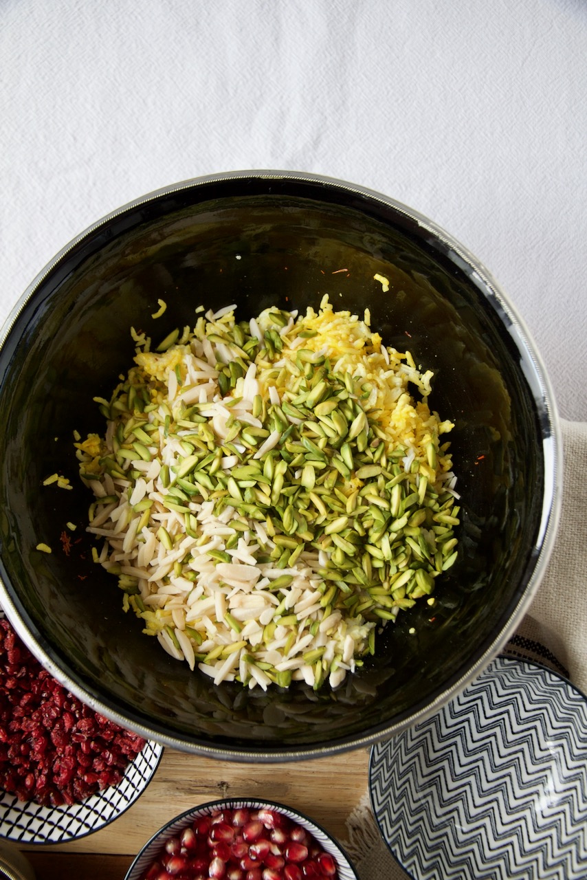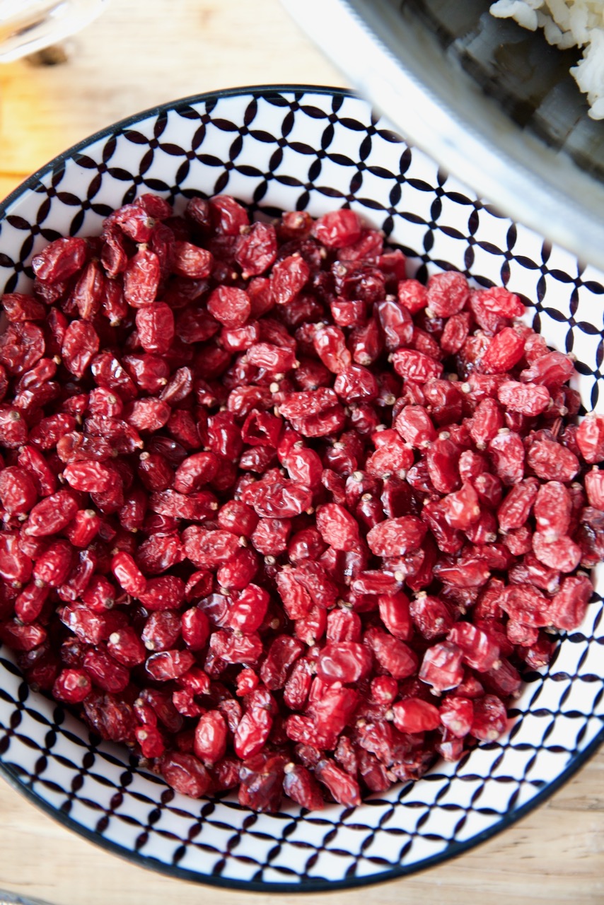 Soak barberries in cold water until everything is prepared, then strain in a colander and dry with a kitchen towel.
