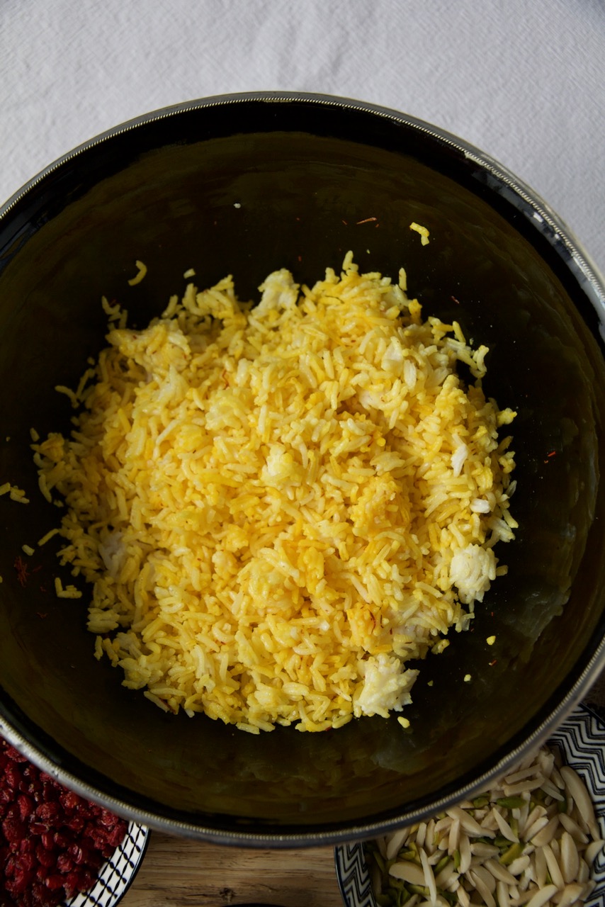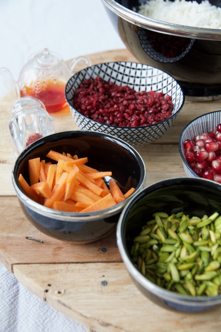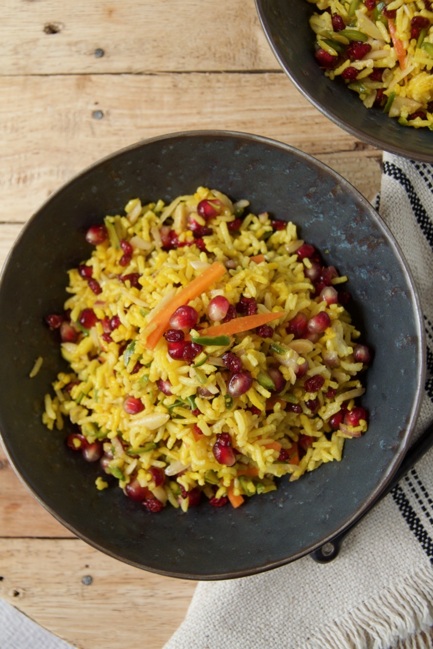 Are you looking for a tasty side dish for a special occasion? How about a bright and fragrant Vegan jeweled rice salad? This rice salad is based on the warm Persian jeweled rice. It’s the perfect summer dish that can easily be prepared in advance. It’s just perfect for a picnic as well as for a special feast or party. The colorful bright jewels in the salad are made of emerald (pistachios), ruby (barberries and pomegranate seeds), gold (saffron rice and carrots), and pearls (almonds). Fragrant saffron and warm spices like turmeric, cumin, cardamom, and cinnamon add that special touch to my rice salad and will impress your guests. My Jeweled Rice Salad is a feast for the senses and transports you directly to the orient.