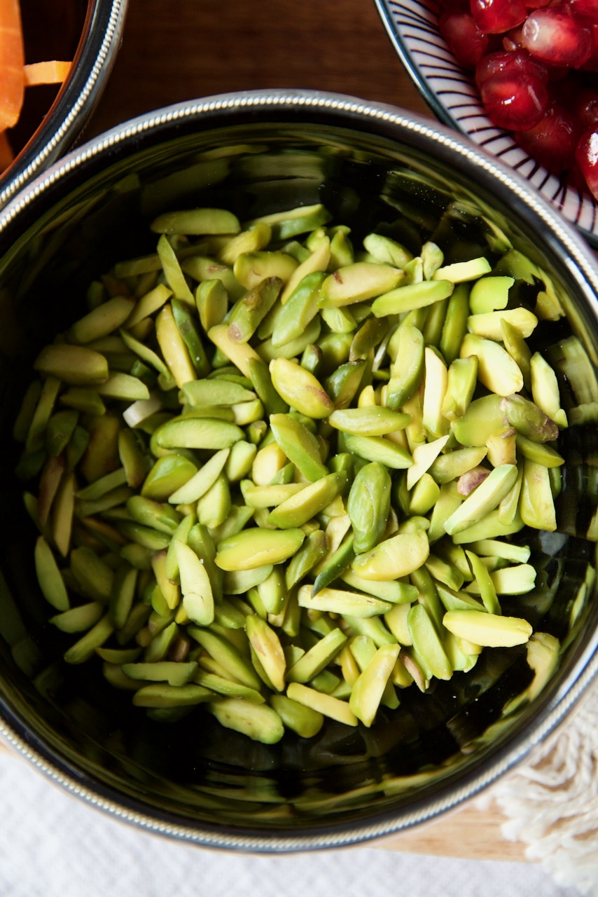Cut the pomegranate in half and remove the seeds. Set the seeds aside.