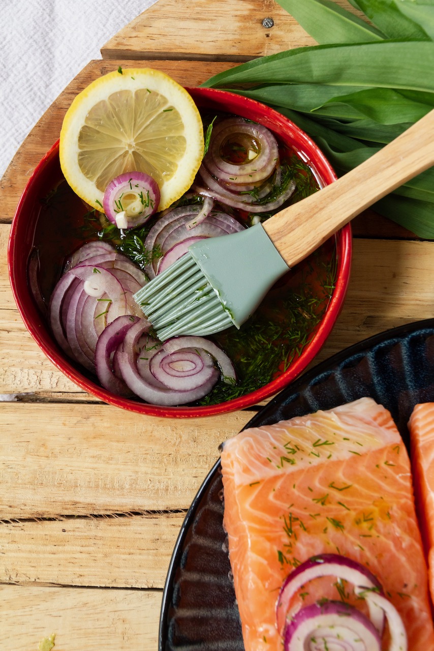 The fresh and aromatic grilled asparagus has tender tips and a crunchy texture that harmonizes well with the wild garlic waffles. To round off the taste experience, I serve a delicious lemon-dill sauce, which gives the dish a fresh touch. Garnish with lemon slices, and this combination of spicy wild garlic, tender salmon, and crunchy asparagus is unbeatable.
